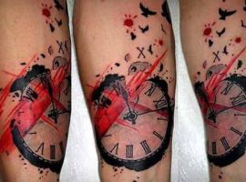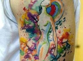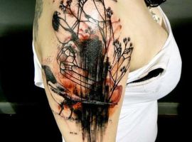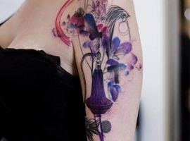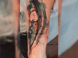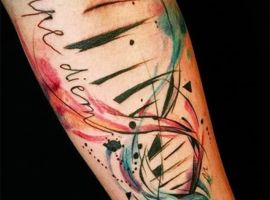 Свежая идея для девушек – совместить абстракцию с техникой акварели. Получится нежный аккуратный рисунок. За основу сюжета можно брать растительные элементы: цветы, листья, лианы. Можно отказаться от реальных предметов и создать нежную картинку, напоминающую цветной дым. Это хороший вариант для тату абстракции на руку.
