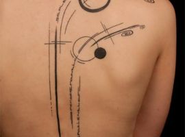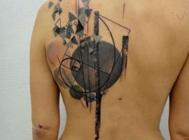 Объёмный вариант требует большой ровной поверхности. Крупные рисунки хорошо смотрятся на спине, эффектны тату на плече. - Не стоит задействовать места, где кожа часто растягивается, деформируется. К примеру, татуировка абстракция, выполненная на животе, требует постоянного поддерживания тела в отличной форме. А вот абстракция на ноге или спине не деформируются со временем.