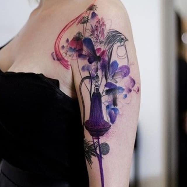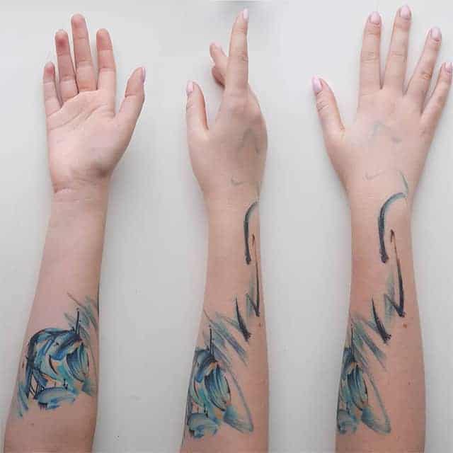 Свежая идея для девушек – совместить абстракцию с техникой акварели. Получится нежный аккуратный рисунок. За основу сюжета можно брать растительные элементы: цветы, листья, лианы. Можно отказаться от реальных предметов и создать нежную картинку, напоминающую цветной дым. Это хороший вариант для тату абстракции на руку.