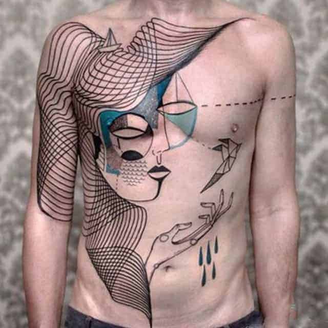 Абстракционизм на теле не зря называют беспредметным искусством. При подготовке будущего эскиза отбрасывают стандартное видение окружающих вещей. Предметы реального мира не изображаются в привычном формате. Вместо них – отдельные фигуры, пятна, полосы, точки. Все эти детали вплетаются в один сюжет, зачастую понятный лишь его автору.