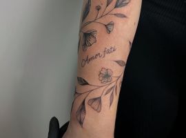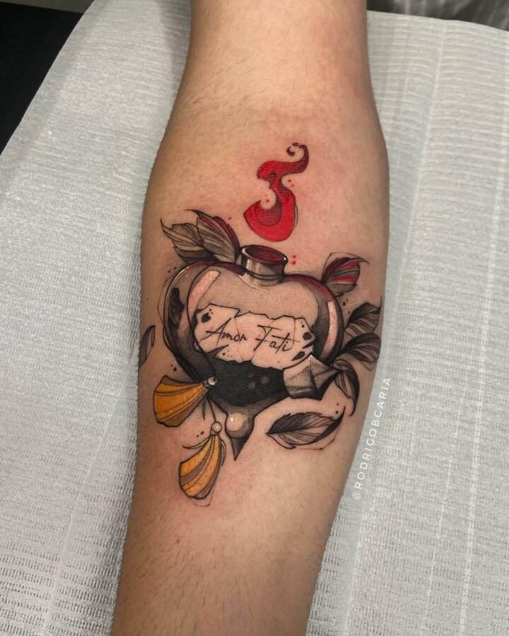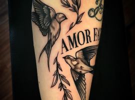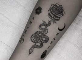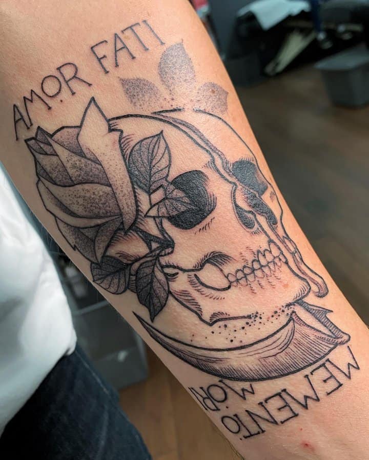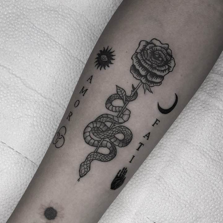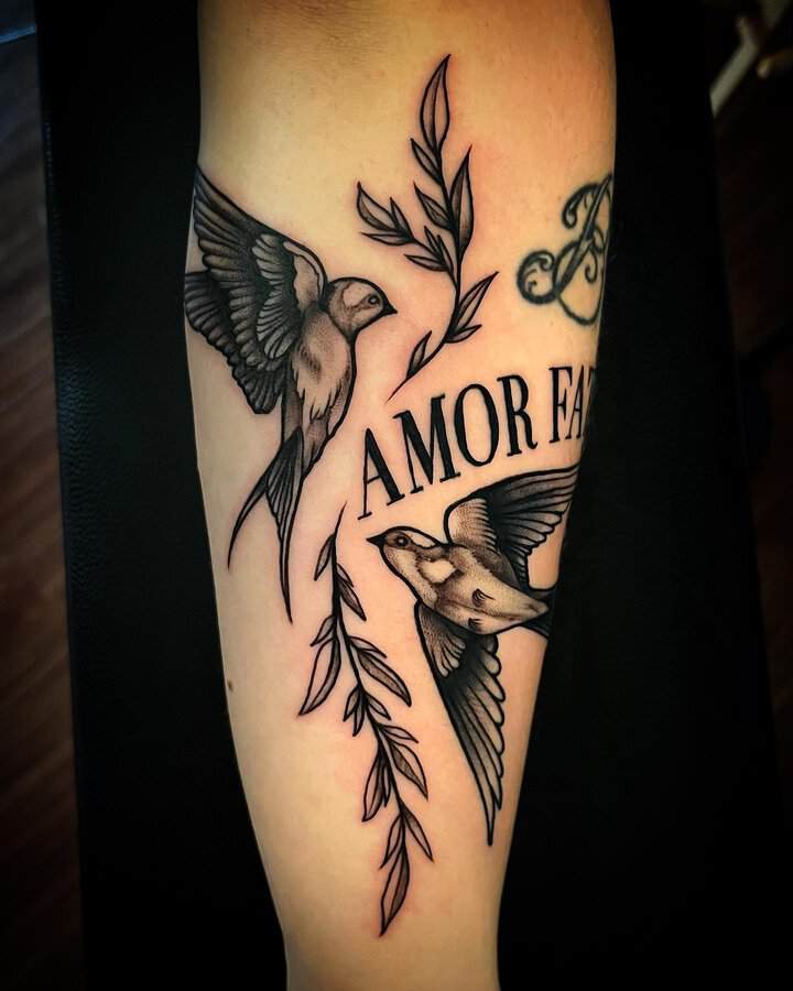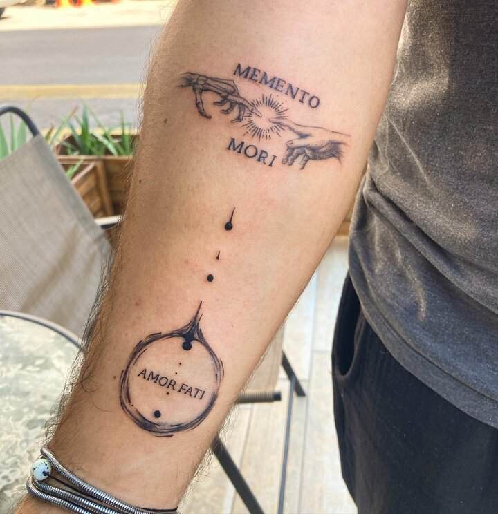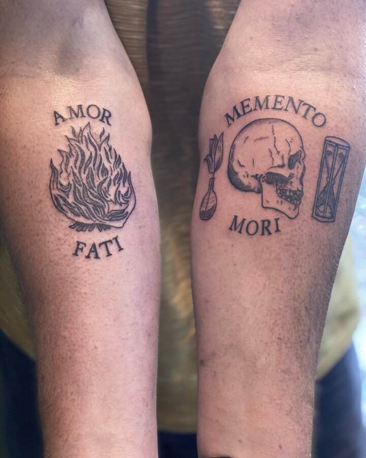 Такие дуэты делают тату уникальным: например, amor fati с песочными часами на запястье – это элегантный минимализм. Амор фаті с цветами часто выбирают для романтического акцента, а с мечом – для динамики.