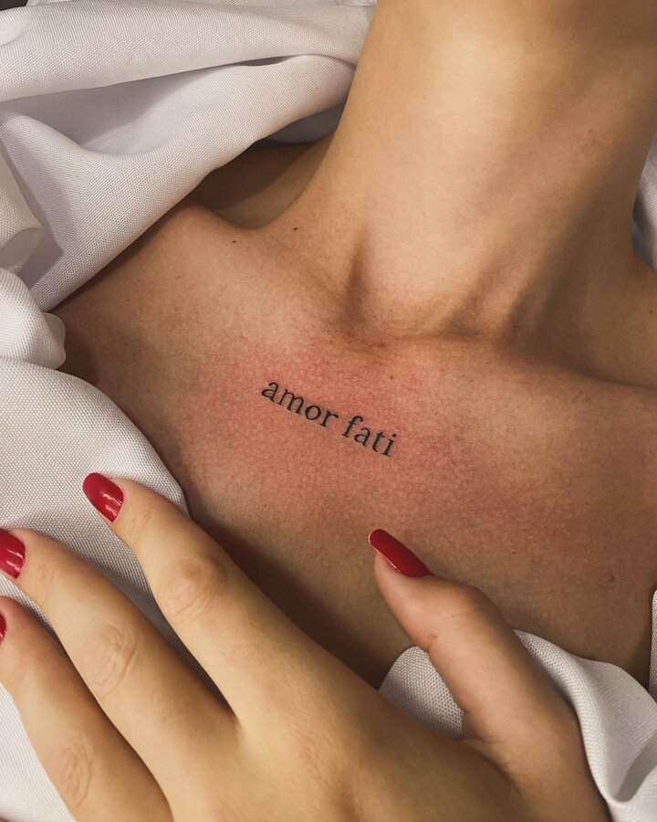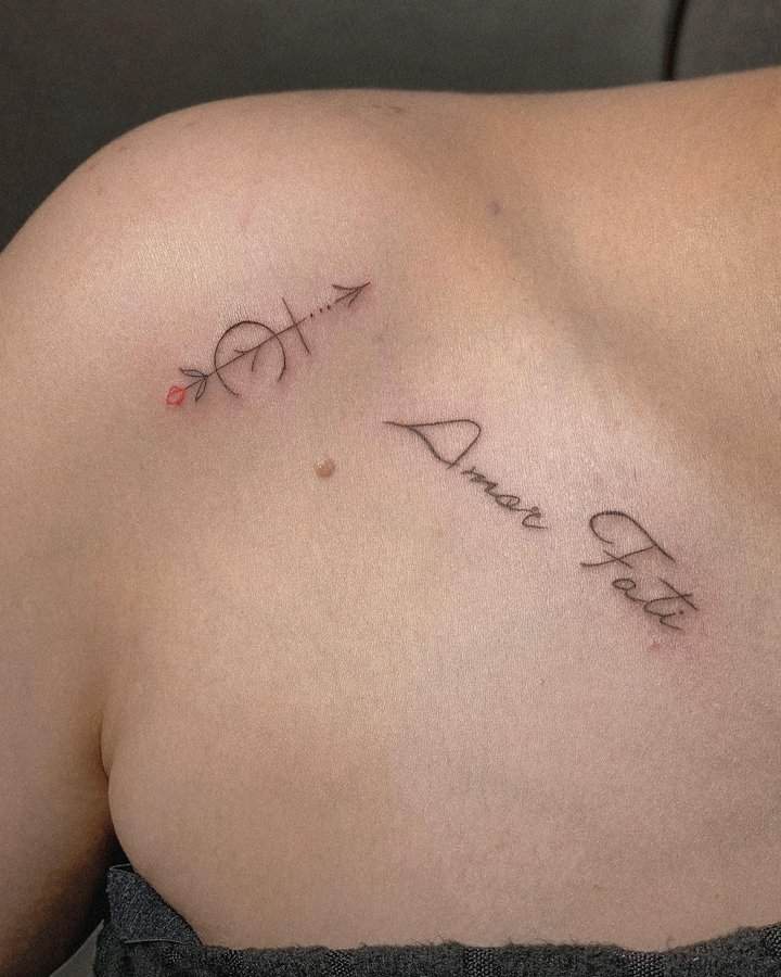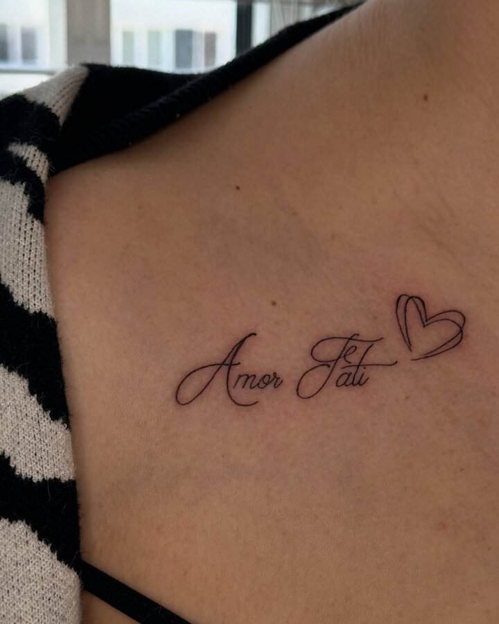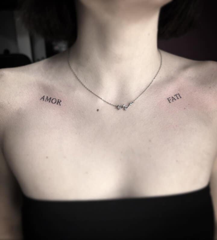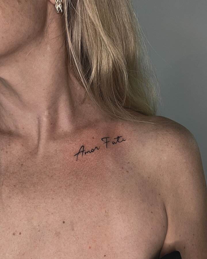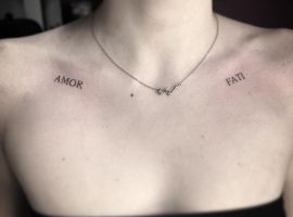 Выбирая место, думайте о стиле жизни: активные люди ставят на предплечье, любители секретов – на рёбра. Амор фаті на ключице часто делают тонкими линиями, чтобы не отвлекать от формы тела.