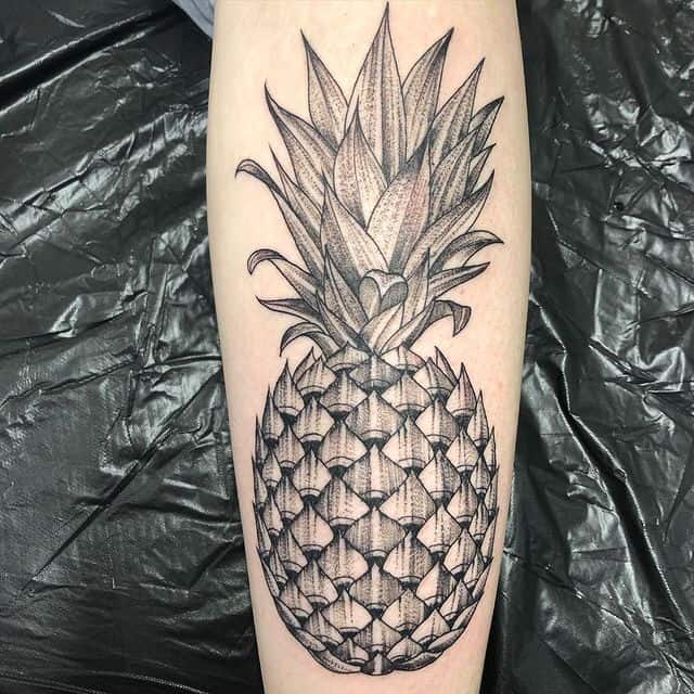 В татуировках ананас чаще делают в ярких цветах, однако и в черно-белом варианте он узнаваем и смотрится очень стильно. Благодаря уникальному виду, его трудно с чем-то спутать и потому можно набивать на коже как в большом объеме, так и в виде маленького символа. Подойдет для такой идеи любой участок кожи: от шеи до щиколотки. Главное – найти хорошего мастера и удачный эскиз. Для этого обратитесь в салон Альянс в Киеве.
