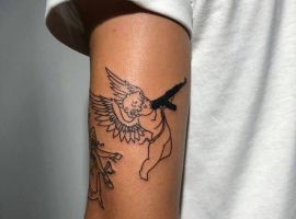 Иногда делают очень оригинальное сочетание: тату купидон с автоматом. Значение такого эскиза будет в том, что любовь беспощадна и не оставляет нам права выбора.