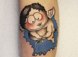 Цвет тоже имеет значение. Яркое тату, выполненное в мультипликационном стиле часто выдает обладателя отличного чувства юмора. Персонажа татуировки ее владелец отождествляет с собой. Озорной малыш, с легкой усмешкой на личике характеризует носителя как покорителя женских сердец, ловеласа, который с легкостью завоевывает девичьи сердца. Любовные истории и похождения окрыляют владельца и придают уверенности в себе.
