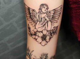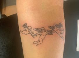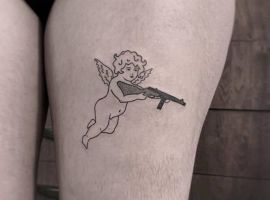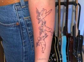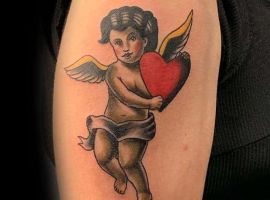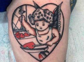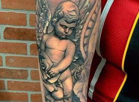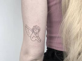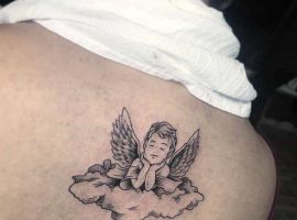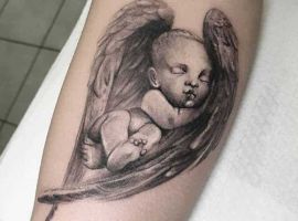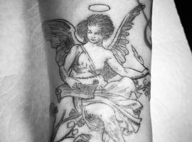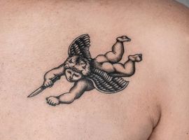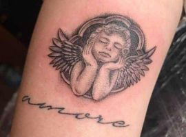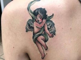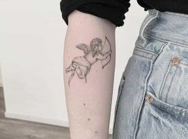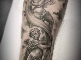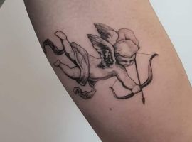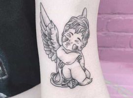 Херувимы встречаются в тату-искусстве достаточно часто. Выглядят в основном они как обнаженные или в белых одеяниях дети с крыльями. Эти картинки на теле символизируют доброту, чистоту души. Самым популярным вариантом считается Купидон со стрелами, который согласно верованиям послан богом, чтобы соединять сердца влюбленных. Образы херувимов распространены в Библии. Они имеют значения: невинность, верность, целомудрие, религиозность и любовь.