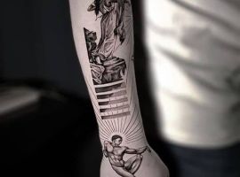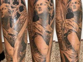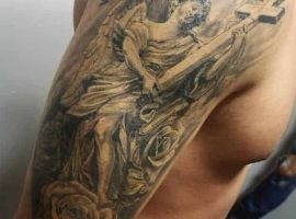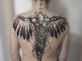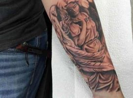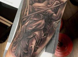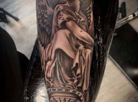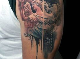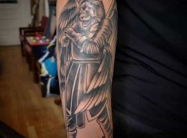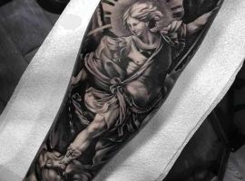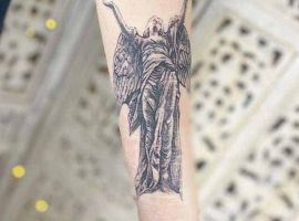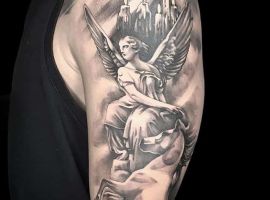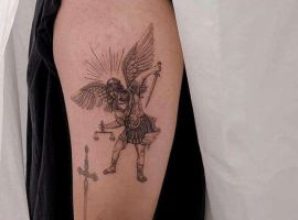 Архангел в татуировке выглядит очень величественно и интересно. Эти ангелы являются хранителями людей от темных сил. В религии их называют посланниками самого Господа, старшими ангелами, это самые сильные и могущественные божественные существа. А татуировка с ними будет иметь значение оберега, защиты. Чаще всего изображается как ангельский воин с мечом или копьем.