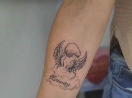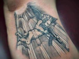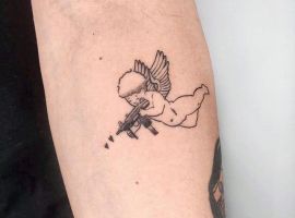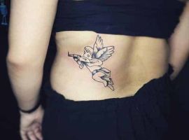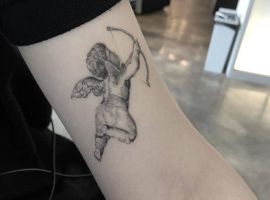 Ангелочки – милые и добрые существа, которых чаще всего можно встретить на женском теле. Этих сказочных или мультяшных персонажей набивают как тату на руке, спине, шее. Популярные идеи тату ангел с нимбом, крылышками, сердцем и стрелами. Выбирают для эскизов маленький размер.