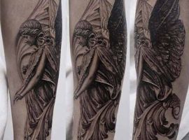 Тату ангел смерти имеет значение страха перед смертью, быстротечность жизни. Такой рисунок может служить постоянным напоминанием о том, что жизнь может оборваться в любой момент, поэтому прожить ее нужно достойно и интересно, жить здесь и сейчас, не упуская новые возможности и открытия. Такой выбор подойдет скорее рискованным людям, которые верят в свою удачу и фарт. Для них татуировка может стать амулетом от недоброжелателей.