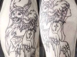 Падший ангел часто встречается в литературе под именем Сатана или Люцифер, которого выгнали из Рая из-за непослушания своему Отцу. Интересно, что он может быть как положительным, так и отрицательным героем, он сам определяет каким хочет быть в конкретной ситуации. Поэтому и нательный рисунок будет обозначать борьбу зла и добра в человеке. Бывает, его наделяют символом чувства вины за причиненную боль близким. Встречается еще значение страха перед смертью, быстротечность жизни.