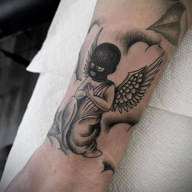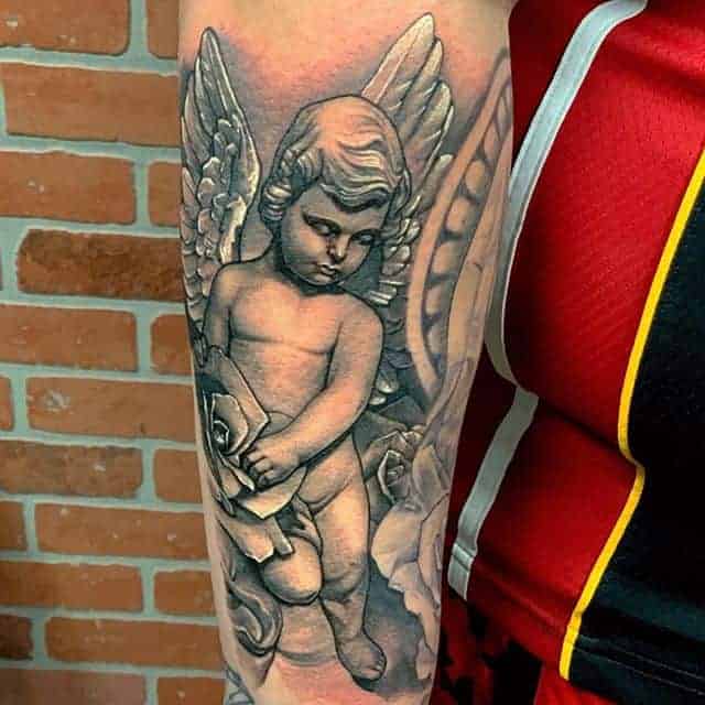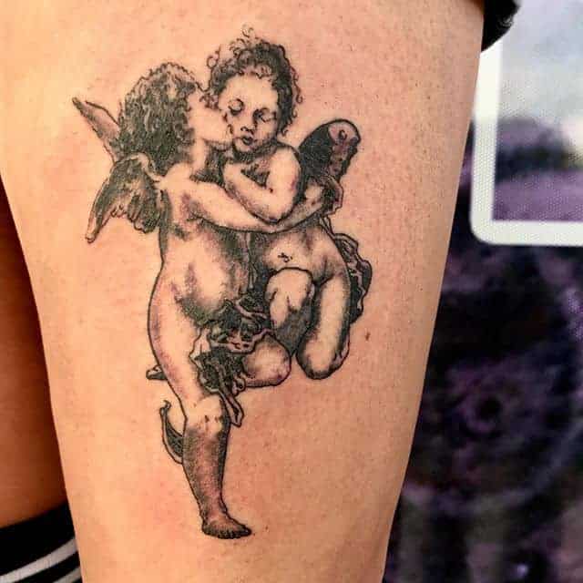 Херувимы встречаются в тату-искусстве достаточно часто. Выглядят в основном они как обнаженные или в белых одеяниях дети с крыльями. Эти картинки на теле символизируют доброту, чистоту души. Самым популярным вариантом считается Купидон со стрелами, который согласно верованиям послан богом, чтобы соединять сердца влюбленных. Образы херувимов распространены в Библии. Они имеют значения: невинность, верность, целомудрие, религиозность и любовь.