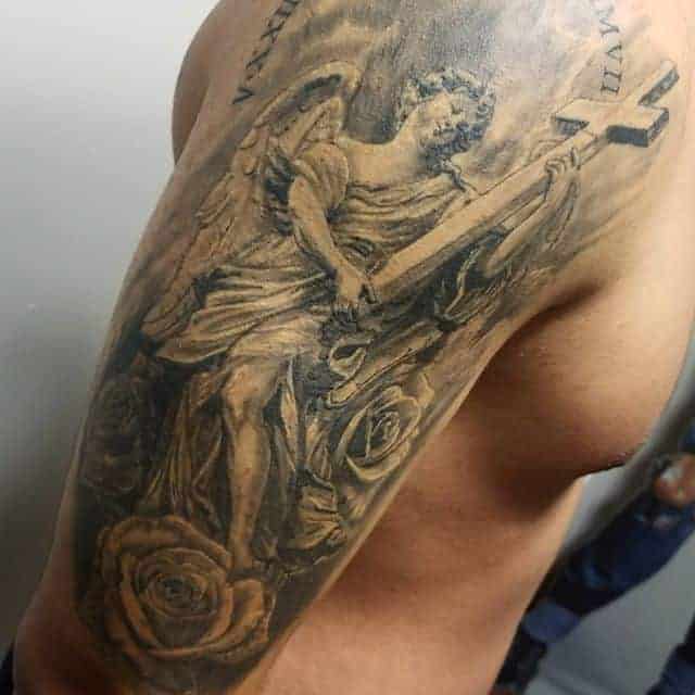 Тату ангелы для мужчин имеют подобный смысл. Чаще всего такой эскиз также выбирают верующие парни, которые рассчитывают на покровительство небес. Такие люди обычно скромные и смиренные, готовы противостоять любым трудностям в жизни и жить по правилам. Они верят, что татуировки с ангелами оберегают их. Также встречаются варианты, когда ангел изображается в композиции с демоном. Такой эскиз означает внутреннюю борьбу мужчины, выбор между добром и злом.