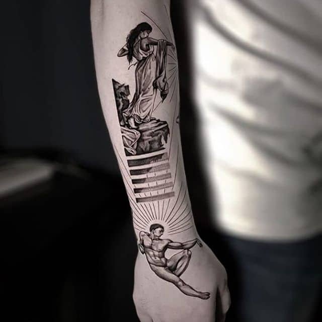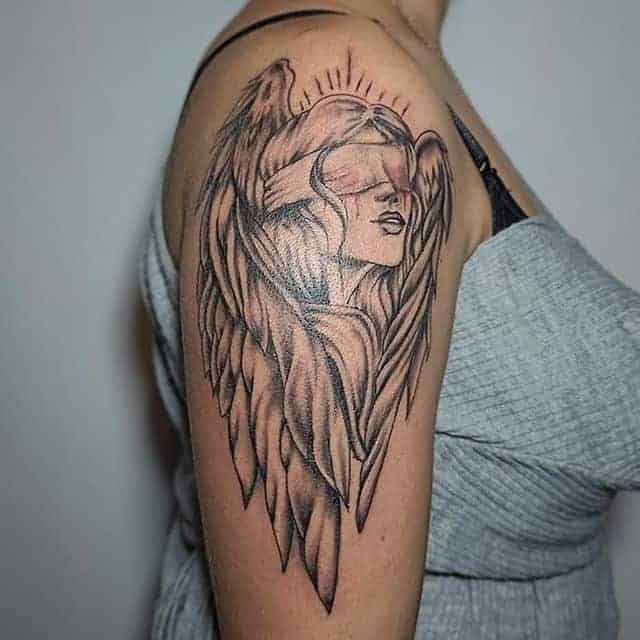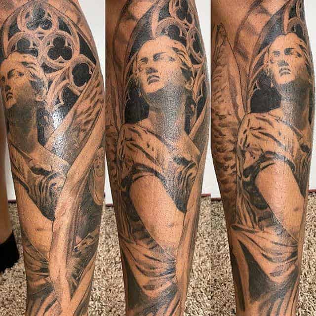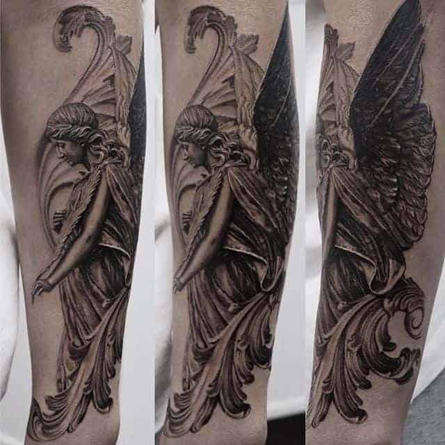 Архангел в татуировке выглядит очень величественно и интересно. Эти ангелы являются хранителями людей от темных сил. В религии их называют посланниками самого Господа, старшими ангелами, это самые сильные и могущественные божественные существа. А татуировка с ними будет иметь значение оберега, защиты. Чаще всего изображается как ангельский воин с мечом или копьем.