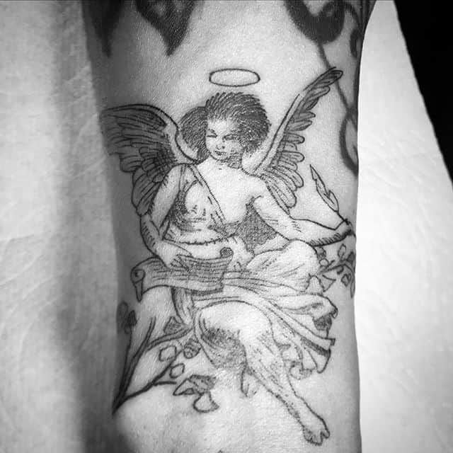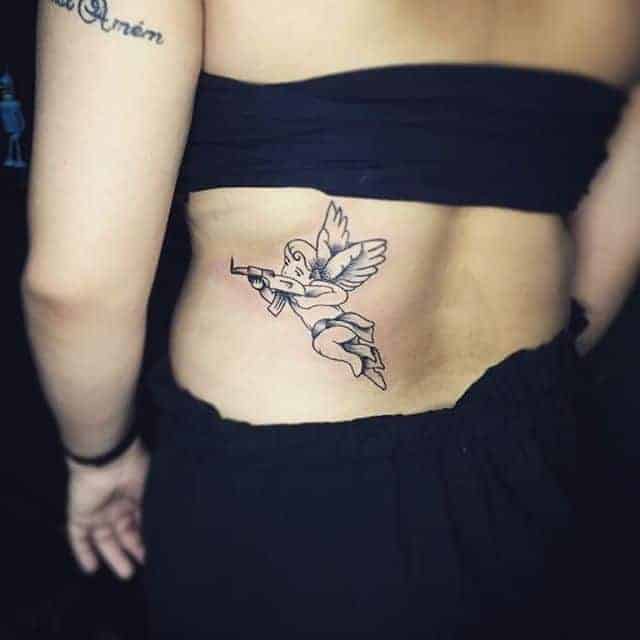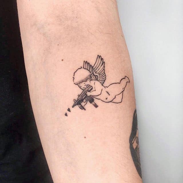 Ангелочки – милые и добрые существа, которых чаще всего можно встретить на женском теле. Этих сказочных или мультяшных персонажей набивают как тату на руке, спине, шее. Популярные идеи тату ангел с нимбом, крылышками, сердцем и стрелами. Выбирают для эскизов маленький размер.