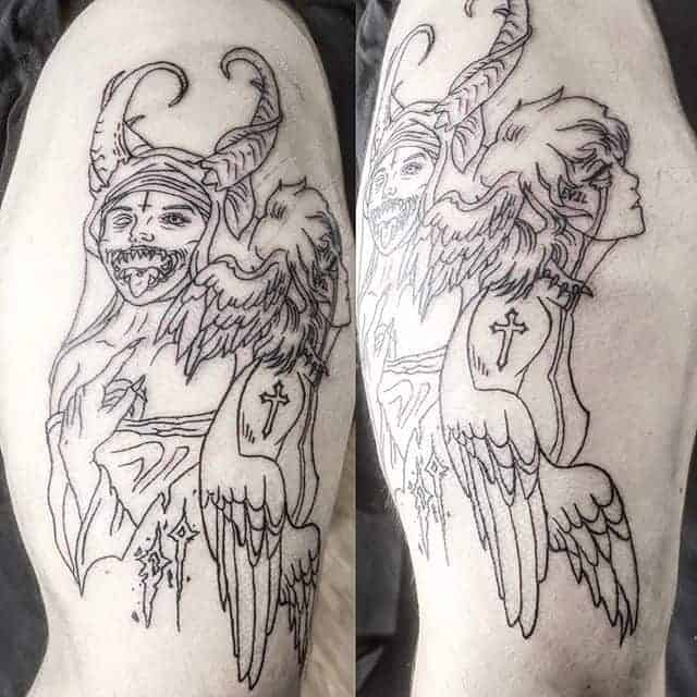 Падший ангел часто встречается в литературе под именем Сатана или Люцифер, которого выгнали из Рая из-за непослушания своему Отцу. Интересно, что он может быть как положительным, так и отрицательным героем, он сам определяет каким хочет быть в конкретной ситуации. Поэтому и нательный рисунок будет обозначать борьбу зла и добра в человеке. Бывает, его наделяют символом чувства вины за причиненную боль близким. Встречается еще значение страха перед смертью, быстротечность жизни.