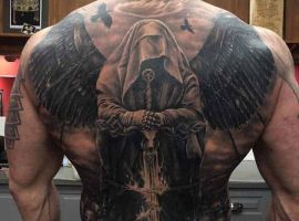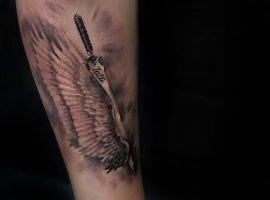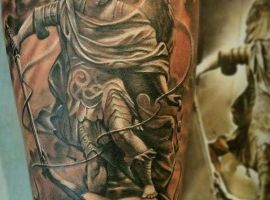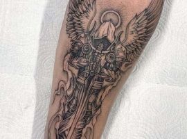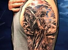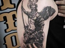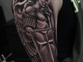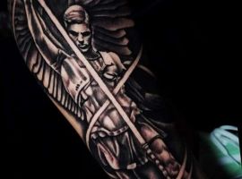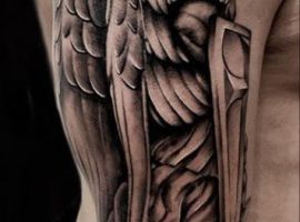 Изображение Архангела с мечом или копьем в руке наносят для укрепления веры в добро и справедливость, из-за стремления иметь сильного защитника. Тату архангел преимущественно мужская идея. Монохромная суровая графика органична на стройном, мускулистом теле.