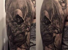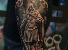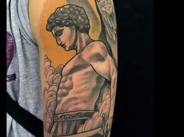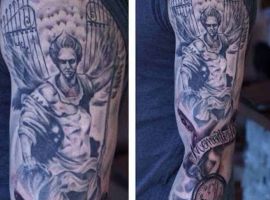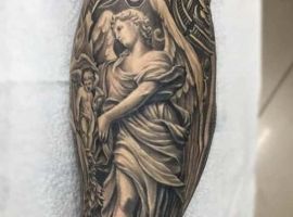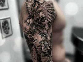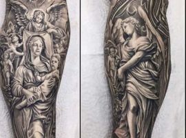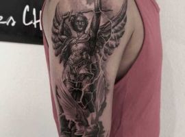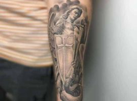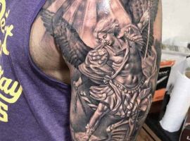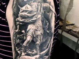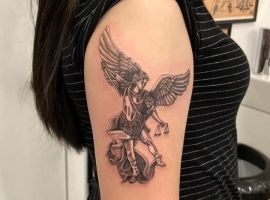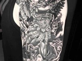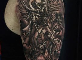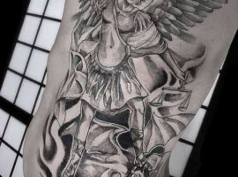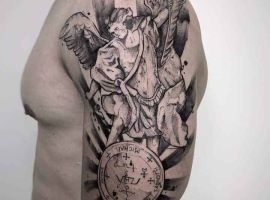 Святой Михаил, попирающий демона – один из самых известных образов Tattoo Art. Он – покровитель и защитник рода человеческого в христианстве, исламе, иудаизме. Один из самых почитаемых библейских персонажей, свергший с небес сатану. В Православии Архистратиг – вождь святого воинства Ангелов.