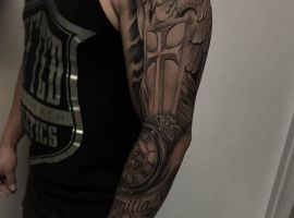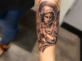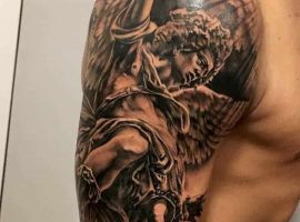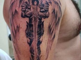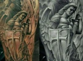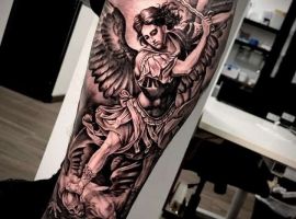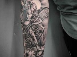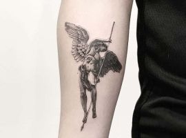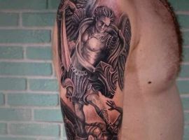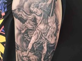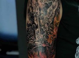 Тату с Архангелом Михаилом, побеждающим дьявола, или изображение Гавриила с лилией в руке – это оригинальное произведения искусства. Татуировка символизирует справедливость божественного промысла, защиту от зла, победу светлых сил. Воплощает поиск истинного пути, благословение духовного мира, помощь в достижении цели.