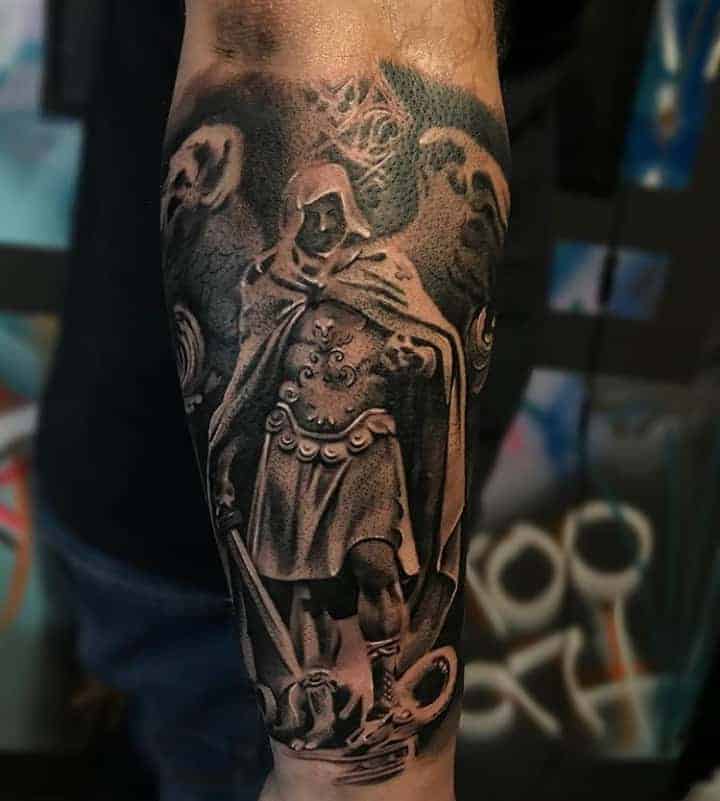 Святой Михаил, попирающий демона – один из самых известных образов Tattoo Art. Он – покровитель и защитник рода человеческого в христианстве, исламе, иудаизме. Один из самых почитаемых библейских персонажей, свергший с небес сатану. В Православии Архистратиг – вождь святого воинства Ангелов.