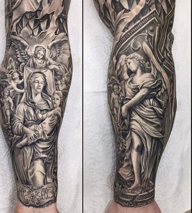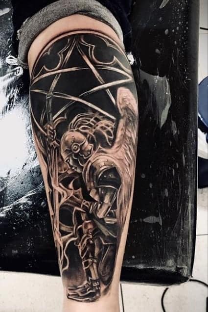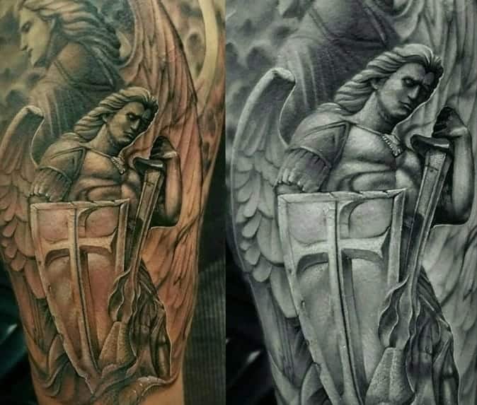Изображение Архангела с мечом или копьем в руке наносят для укрепления веры в добро и справедливость, из-за стремления иметь сильного защитника. Тату архангел преимущественно мужская идея. Монохромная суровая графика органична на стройном, мускулистом теле.