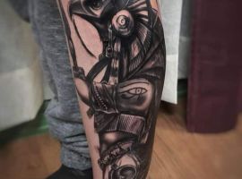 Бог Ра тату смотрятся довольно необычно, но вместе с тем привлекательно. Вряд ли кто-то выберет такую идею для тату просто так, руководствуясь только визуальной привлекательностью рисунка. Скорее выбор будет обусловлен тем, что человеку близка эта древнеегипетская мифология.