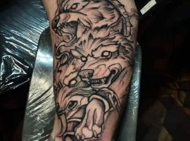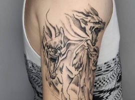 Иногда композиция тату передает раненого зверя. Стрелы и копья, пронзающие тело цербера, говорят о победе хозяина над своими изъянами.