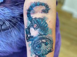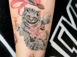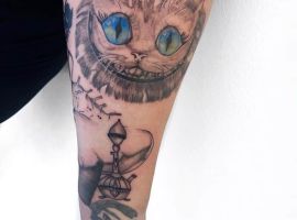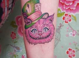 Самый распространенный вариант – это тату Чеширский кот на руке. Здесь можно идеально разместить рисунок среднего размера. Если хочется добавить легкости, то выбирайте стиль «Акварель». Он символизирует плавность и воздушность. Кроме того, улыбчивый персонаж хорошо смотрится в качестве одного из элементов рукава.