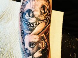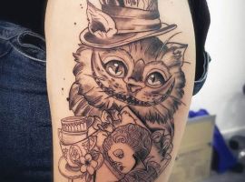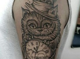 Еще один хороший вариант – тату Чеширский кот на плече. Площадь позволяет изобразить не только персонажа, но и его основные атрибуты. Например, кот никогда не расставался со своими часами. Если хотите, чтобы изображение получилось монохромным, отдавайте предпочтение графике.