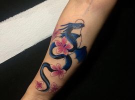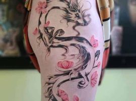 - Цветы, например, сакура: Сакура олицетворяет красоту жизни и ее быстротечность, напоминая ценить каждый момент. С драконом она балансирует мощь нежностью, символизируя гармонию силы и уязвимости – прекрасно для тех, кто ищет равновесие в душе.