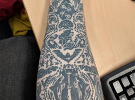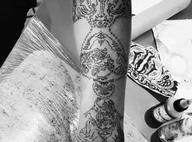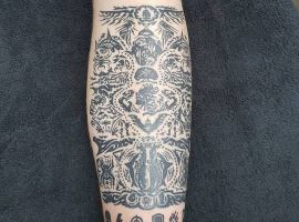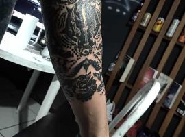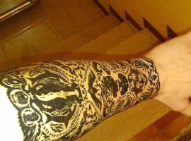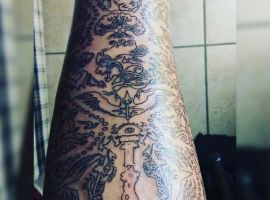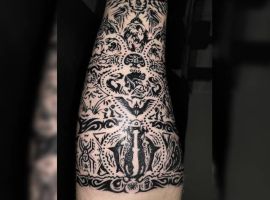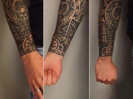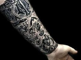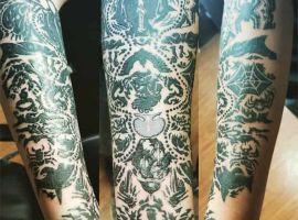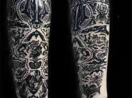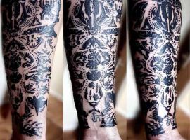 Рисунок в виде орнамента, который состоит из различных элементов, символов. В нем плавно переплетаются линии, которые делают общее изображение гармоничным и целостным. Тату из видеоигры выполнены в монохромном стиле. В них присутствует только белый и черный оттенки.