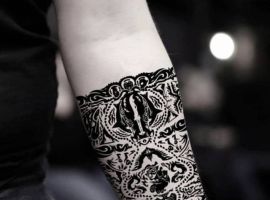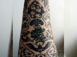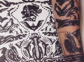 Рисунок в виде орнамента, который состоит из различных элементов, символов. В нем плавно переплетаются линии, которые делают общее изображение гармоничным и целостным. Тату из видеоигры выполнены в монохромном стиле. В них присутствует только белый и черный оттенки.