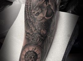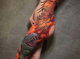 Красочная картинка оригинально впишется на любой участок тела – на ноге, тату на руке, животе, спина или шея. В зависимости от масштабов и пожеланий к эскизу, тату мастер может создать настоящие шедевры, композиции и целые сюжеты с тату феникс на спине или тату Жар птица на животе. Интересно выглядят изображения феникс на руке, часто со временем дополняя новыми элементами, получается рукав с выходом на грудь или спину. Подходящие места к огненному существу – тату феникс на бедре, тату Жар птица на боку. При необходимости, рисунки можно будет легко спрятать вне зависимости от их размеров. Мастера студии «Альянс» в Киеве создадут для Вас красивый эскиз.