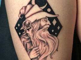 - Волшебники. Седовласый старец в длинном одеянии, красивая ведьма с магическим шаром, Гарри с волшебной палочкой, убивающий «того-кого-нельзя-называть» – все это отличные идеи для фэнтези татуировки.