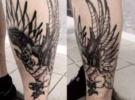 О хищной натуре филинов известно, все та же таинственность породила репутацию кровожадных убийц. Эти птицы действительно не знают пощады и могут нападать даже на такого грозного противника, как волк. Но на самом деле такие подвиги филина – вынужденная крайность. Да, филин не отступит перед опасностью, но он рационален и не будет зря испытывать судьбу. Любимая добыча наших лесных филинов – ежи и зайцы, а также более мелкие пернатые. Человек, который переносит природные повадки филина самовыражением через тату, тоже не склонен неоправданно рисковать. Но татуировка с филином свидетельствует о том, что лучше носителя такого знака не выводить из себя, потому как знак филина красноречиво говорит о том, что любое начинание будет доведено до конца и вызванные реакции могут быть чрезмерно серьезными.