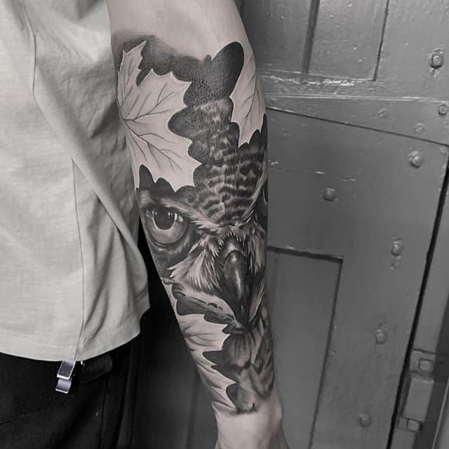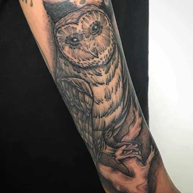 Очень эффектно смотрятся татуировки с филином, если человек смело выделяет достаточно места на собственном теле, чтобы продемонстрировать монументальность фигуры птицы. Такие татуировки хороши как в графике, так и в реализме. Но тату с филином не менее успешно исполняются и в других стилях, например, в духе нью-скула.
