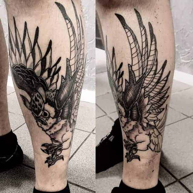 О хищной натуре филинов известно, все та же таинственность породила репутацию кровожадных убийц. Эти птицы действительно не знают пощады и могут нападать даже на такого грозного противника, как волк. Но на самом деле такие подвиги филина – вынужденная крайность. Да, филин не отступит перед опасностью, но он рационален и не будет зря испытывать судьбу. Любимая добыча наших лесных филинов – ежи и зайцы, а также более мелкие пернатые. Человек, который переносит природные повадки филина самовыражением через тату, тоже не склонен неоправданно рисковать. Но татуировка с филином свидетельствует о том, что лучше носителя такого знака не выводить из себя, потому как знак филина красноречиво говорит о том, что любое начинание будет доведено до конца и вызванные реакции могут быть чрезмерно серьезными.