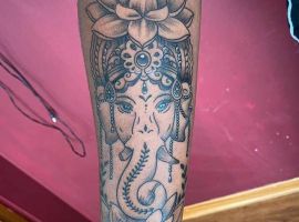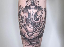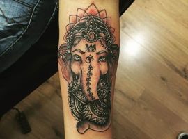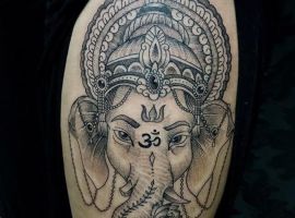 Ганеша – это индийский бог достатка, который широко почитается в восточной культуре. Отличительная черта, что он изображается с головой слона! Нередко можно встретить татуировки Ганеша и на европейцах, то есть тех, кто принадлежит к христианству. Связано это с богатой символикой древнего индийского бога. Он считается символом мудрости, знания, благополучия. Такая тату на теле становится защитой и амулетом богатства и непобедимости. Владельцы изображения Ганеши на теле считают, что бог помогает им обрести счастье, финансовое благополучие и всегда быть удачливыми. Мастера в нашем салоне тату Альянс делают эскизы древнего бога довольно часто, и, нужно отметить, что популярность этого тату не становится меньшей со временем.