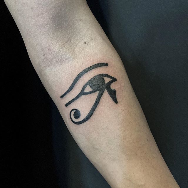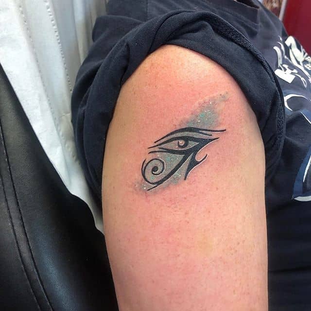 Таким образом, Глаз Гора, также называемый Уаджет, – египетский символ, связанный с богом Солнца, несущий защитную энергию. Он стал известным как символ защиты, власти и исцеления. Вскоре этот символ стал обычным и его можно увидеть среди артефактов и в гробницах с мумиями, а также в виде ювелирных украшений. Эскиз тату выглядит как глаз, дополненный внизу спиралевидно изгибающейся линией.