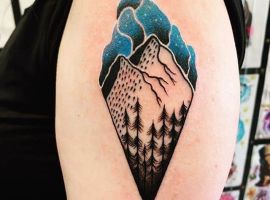 Конечно, в выборе стиля для татуировки нет четких правил. Цвет тату – это личное пожелание каждого, ведь мастеру по сути все равно какие краски использовать. Горы могут быть выполнены как в типичной коричневой, желтой цветовой палитре, так и с использованием фантазийных оттенков, к примеру, алого, голубого или фиолетового.