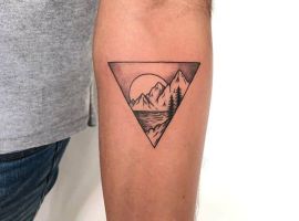 Особенной популярностью сейчас пользуются горы тату в треугольнике. Обычно выполняют их в монохромном варианте. Лучше всего смотрятся тату в треугольнике на запястье, на ноге, на колене.