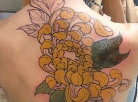 - Спина. Татуировки хризантемы на спине могут быть какими угодно. Это как и масштабная абстрактная композиция, так и удлиненный цветок, растянувшийся по позвоночнику. Также можно украсить и лопатку небольшим растением.
