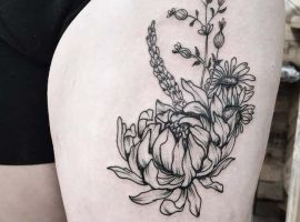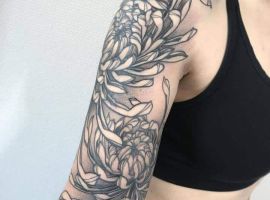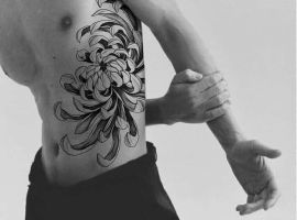 Также часто встречается и классическое черно-белое изображение хризантемы. Это контурный рисунок на теле, который одинаково хорошо подойдет как для парня, так и для девушки. Нередко тату-мастера дополняют цветы шипами, а сами стебли хризантемы причудливо переплетаются между собой.