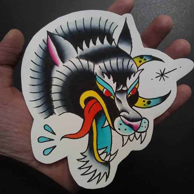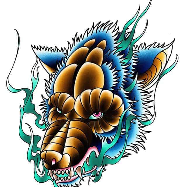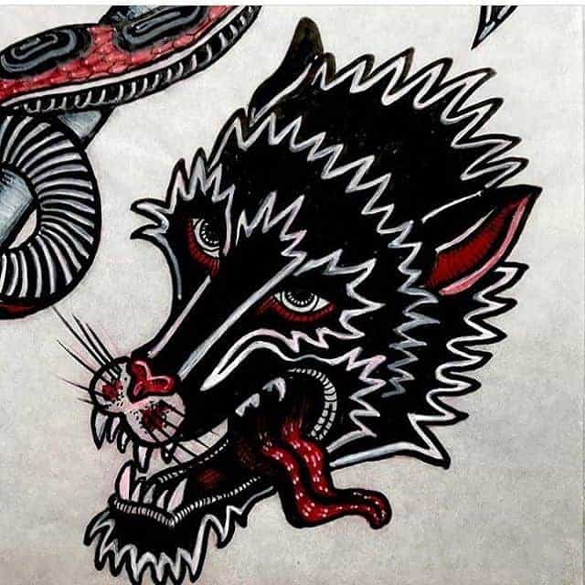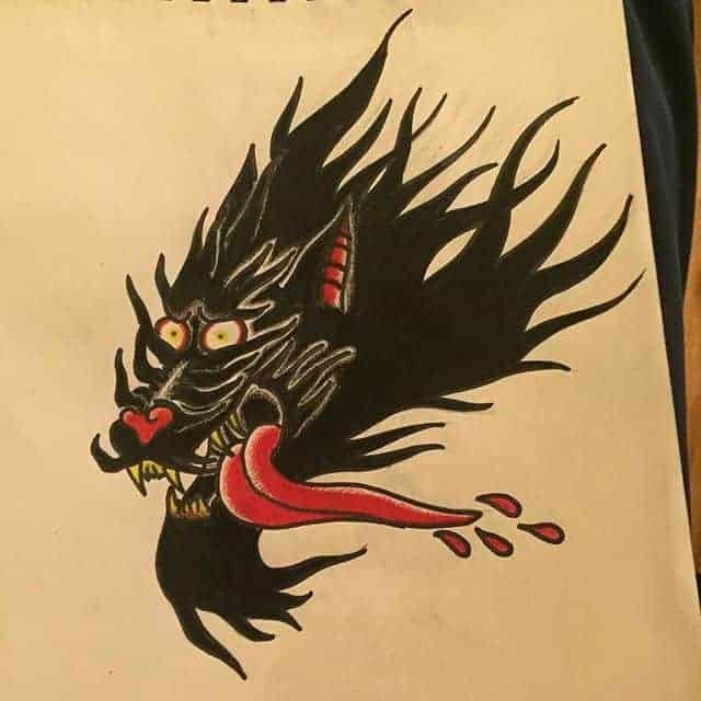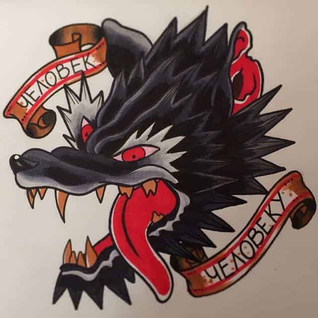 Сочетание татуировки волка с языками огня указывает на негативные качества, может символизировать демоническую сущность, темное начало. Глаза в огне часто связаны с черной магией. Иногда также вокруг этого зверя изображают лес. Окружение деревьев обозначает стремление преодолеть негативные качества характера.
