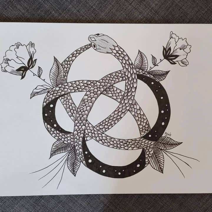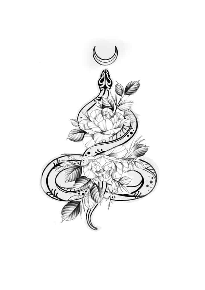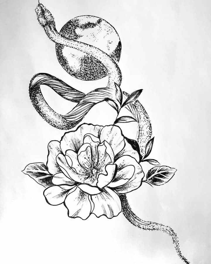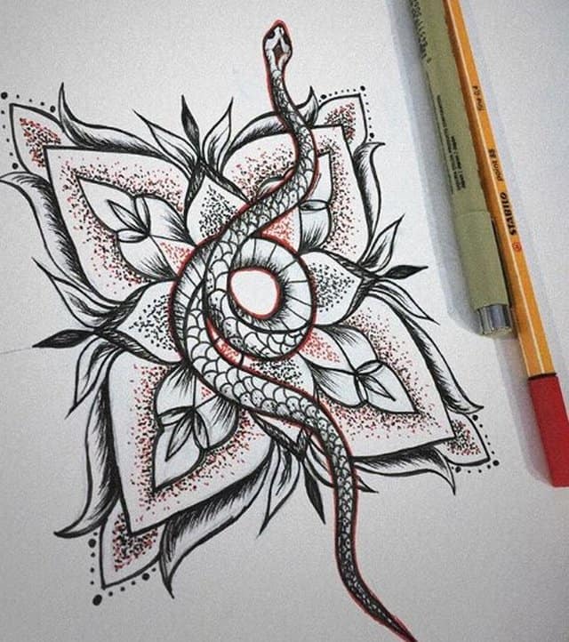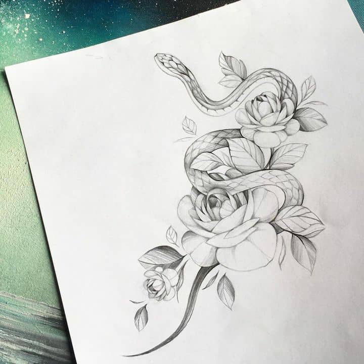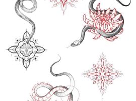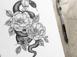 Девушки редко выбирают эскизы тату с одной лишь змеей. Рептилию дополняют следующие символы: