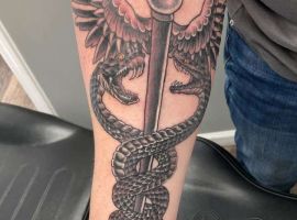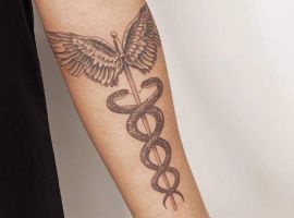 - Кто и в каких стилях делает тату с Кадуцеем?