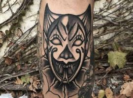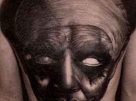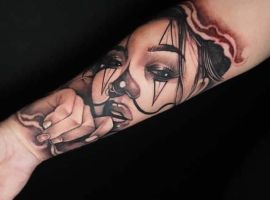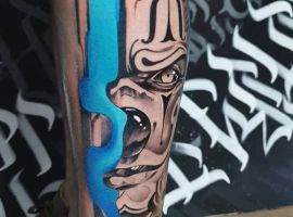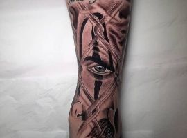 - Негативные. У лиц в этих татуировках злые оскалы, усмешки, скрещенные брови, острые скулы. Во взгляде легко читается сарказм, ненависть и нетерпимость. У такой тату значение будет прямо противоположное. Это насмешка над обществом, над принятыми правилами, возможно, и над конкретными людьми. Татуировка означает, что человек устал мириться со всем происходящим.