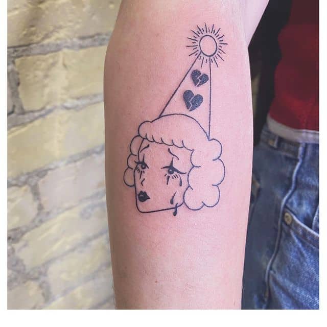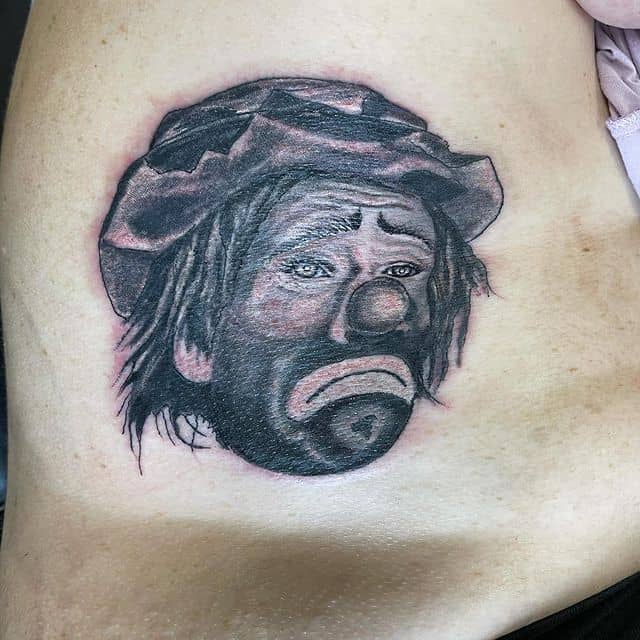 Печальный клоун, пожалуй, можно назвать одним из самых депрессивных тату среди всех. Такой эскиз значит, что человек узнал на себе, что значит предательство, ложь, лицемерие, страх.