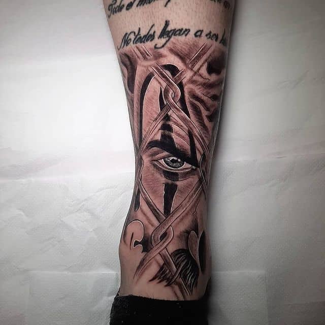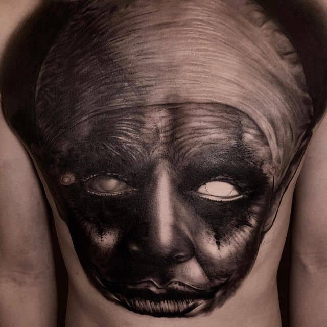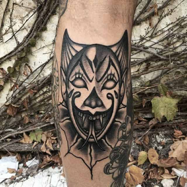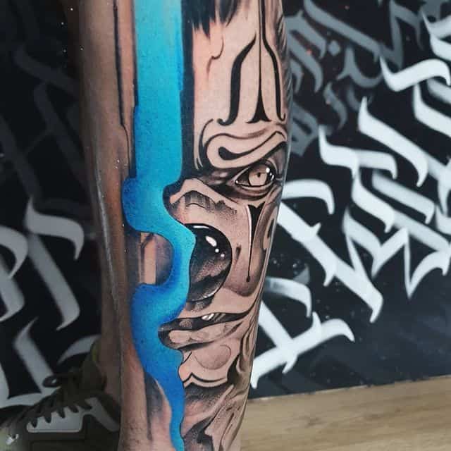 - Негативные. У лиц в этих татуировках злые оскалы, усмешки, скрещенные брови, острые скулы. Во взгляде легко читается сарказм, ненависть и нетерпимость. У такой тату значение будет прямо противоположное. Это насмешка над обществом, над принятыми правилами, возможно, и над конкретными людьми. Татуировка означает, что человек устал мириться со всем происходящим.