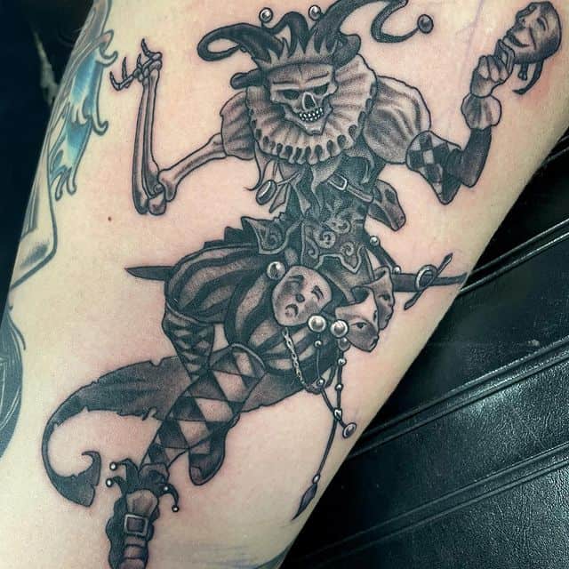 Такие тату шута – это преимущественно вариант для мужчин. Женщины предпочитают выбирать эскизы шута тату с более элегантными чертами. Обычно в рисунках для девушек присутствуют цветы, воздушные шарики и другие аксессуары…Чаще это забавные и добрые маски, но, конечно, могут быть и агрессивные, злые.
