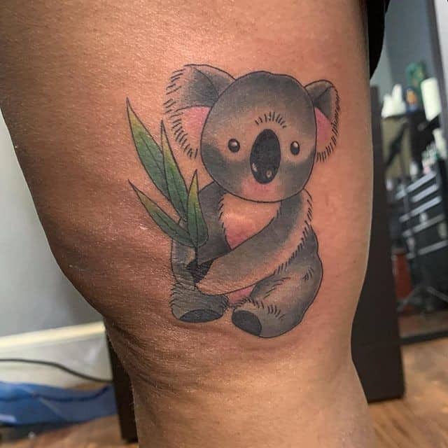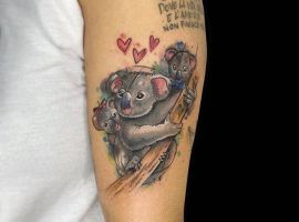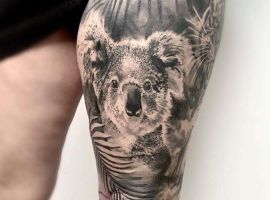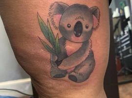 Девушки, которые выбирают татуировку с коалами, без ума от внешнего вида этого зверька. Мило выглядит серый мишка, который раскинулся и отдыхает на травке. Такая добродушная татуировка может говорить о том, что представительница прекрасного пола любит уединение, природу и животных.